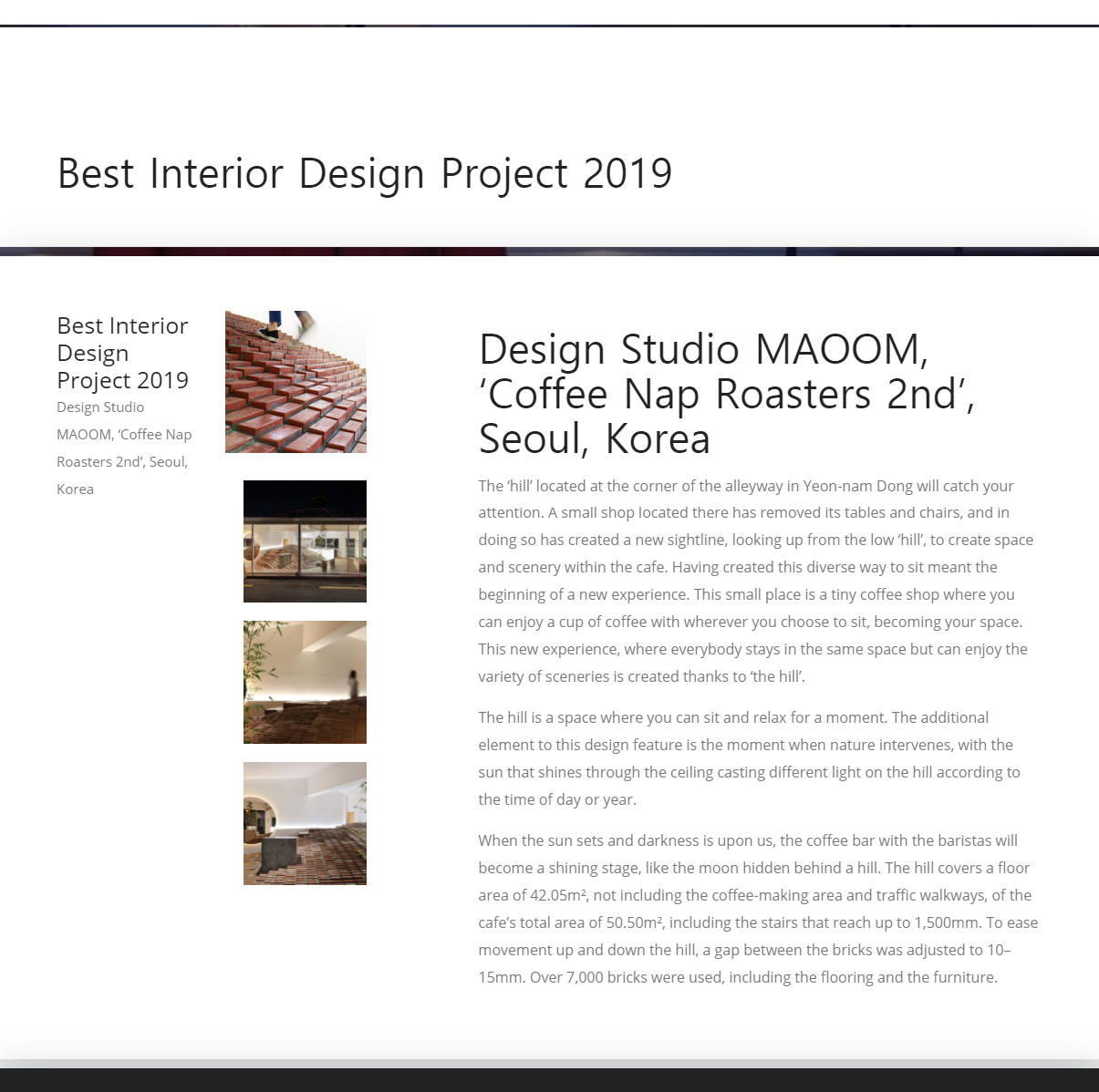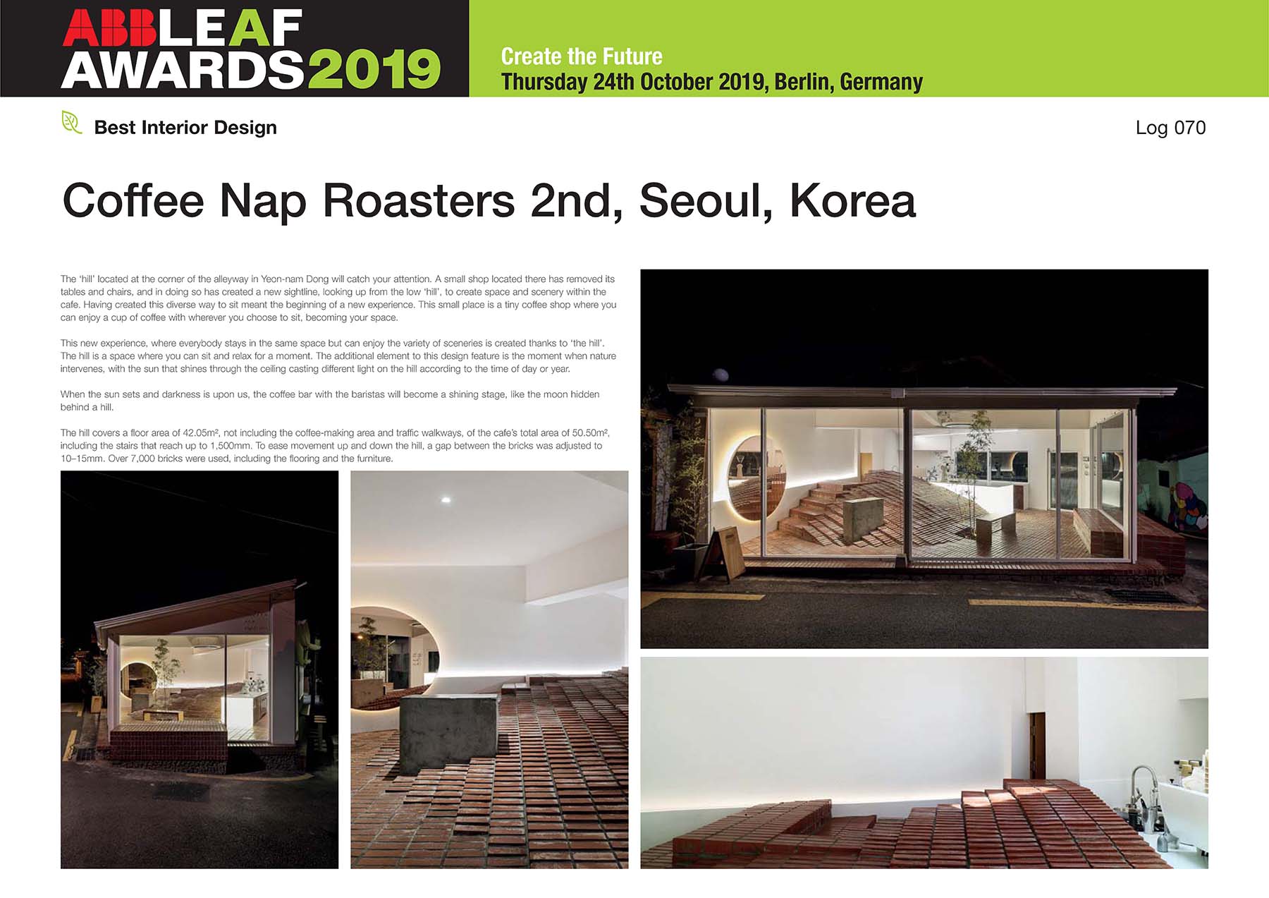 ABB LEAF Awards 2019 - Best Interior Design Project Awards Winner로 수상한 작품 Coffee Nap Roasters 2nd는 2018년 5월에 연남동에 오픈 했으며 50.5㎡작은 공간에서는 “앉다” 라는 방법에 필요한 “자리”(테이블과 의자)의 개념을 비우고 대신 쉬어가는 낮은 언덕을 두고 보니, 시선이 머무는 곳이 자리가 되고 또 다른 풍경이 된다는 이야기를 담고 있다. 즉 앉는 방법이 다양하다는 것은 불편함을 넘어 새로운 자리와 함께 새로운 경험의 시작을 의미하고 이 작은 언덕에 앉는 곳이 자리가 되는 새로운 방식의 커피를 즐기는 가장 작은 언덕을 갖은 카페 공간을 디자인했다.