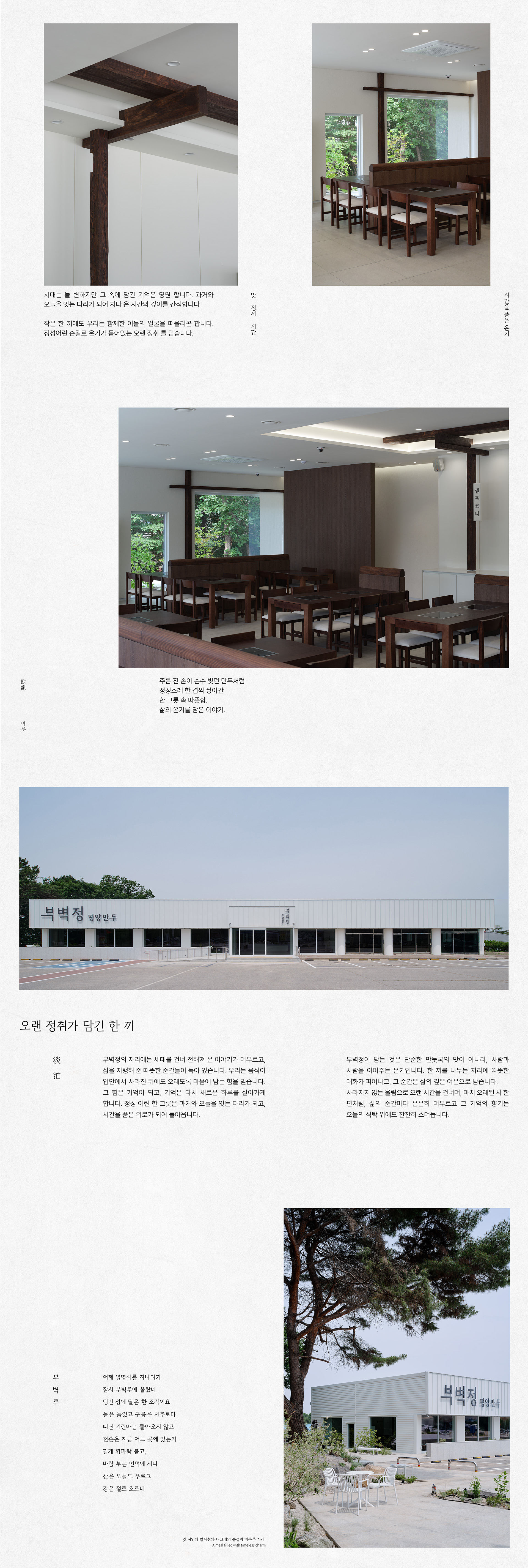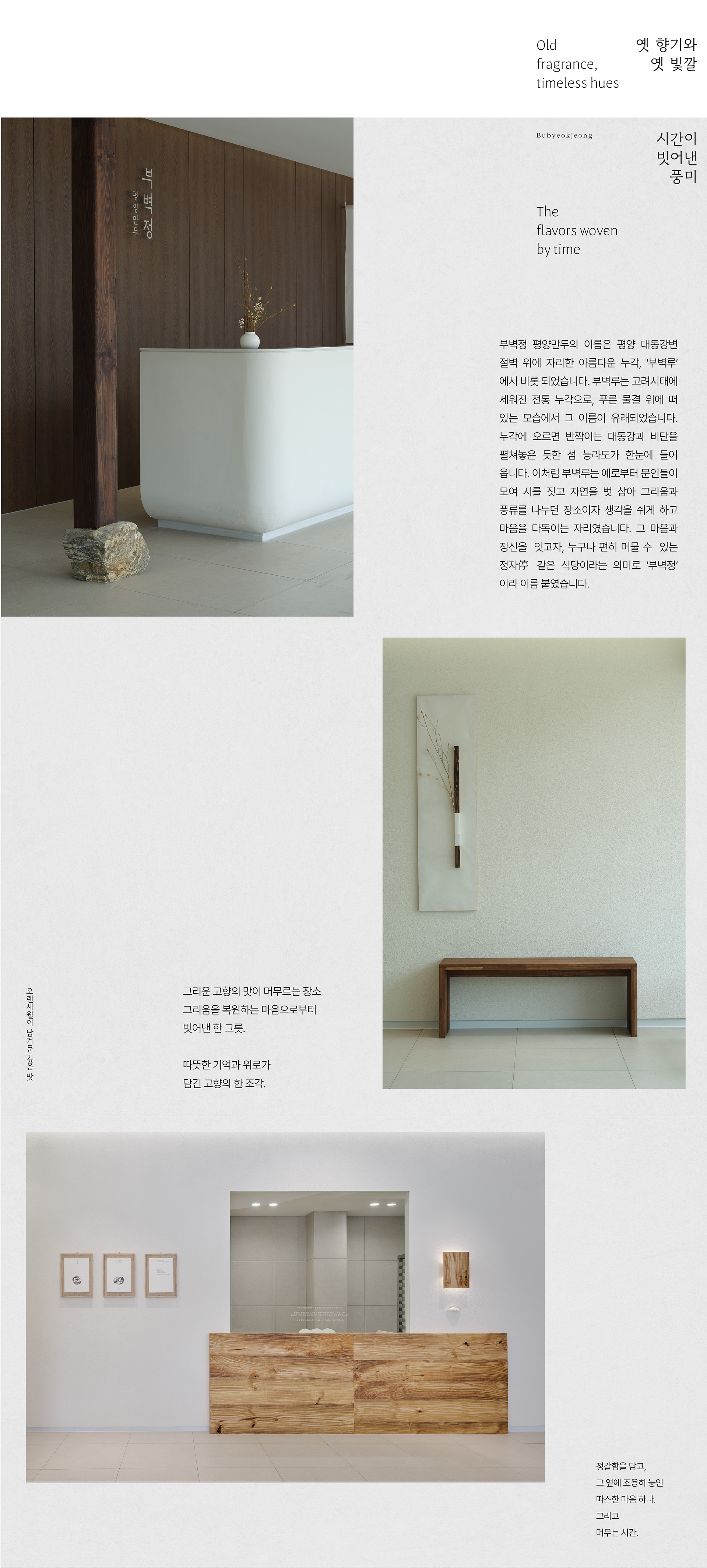 부벽정은 오랜 정취가 담긴 한끼를 전합니다. 아스라히 남은 고향의 풍경, 어머니의 품 같은 안락함, 기억 저편에 자리한 조각들을 사려 깊게 담아,